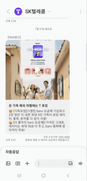 MMS처럼 이미지를 첨부하면서, 이미지 클릭 시 재생될 영상 URL만 추가하면 됩니다. 첨부한 이미지는 동영상 미리 보기 화면으로 사용되며, 이미지 클릭 시 단말기 상단에 PIP 형태로 영상이 재생됩니다.
